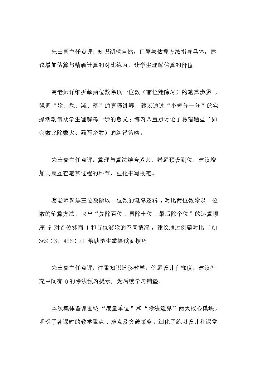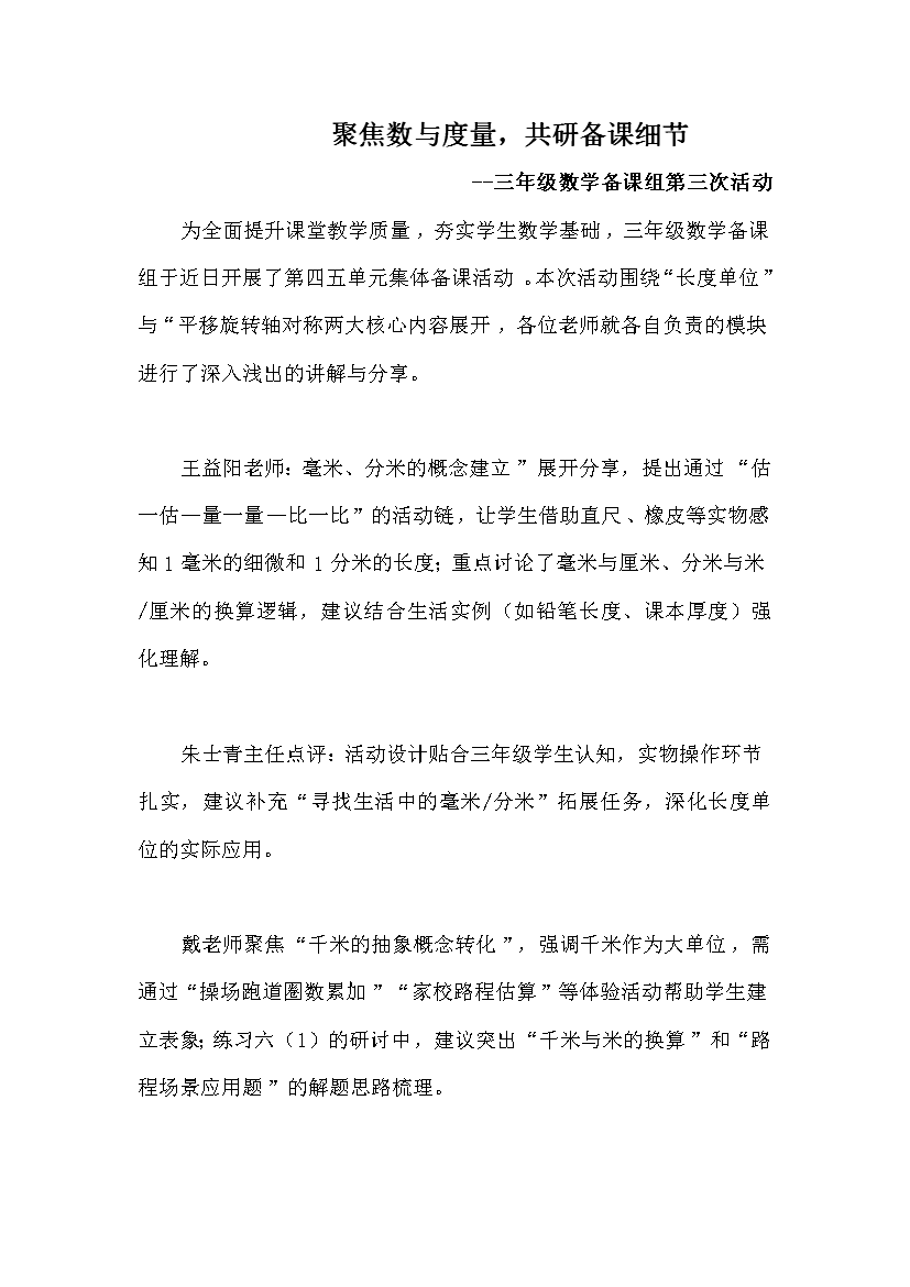 聚焦数与度量,共研备课细节 --三年级数学备课组第三次活动